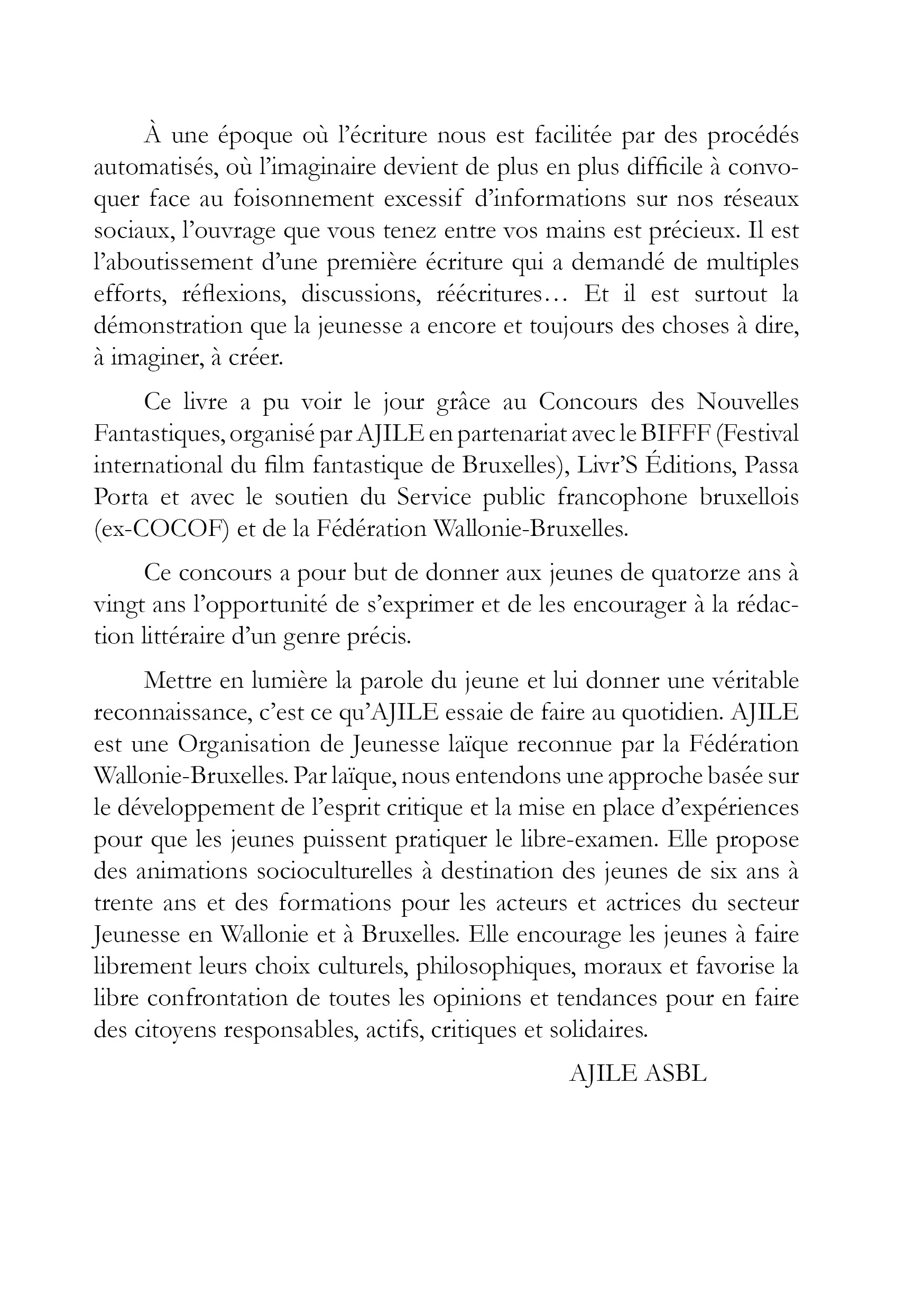 Cette anthologie est le fruit d’une collaboration avec l’ASBL AJILE, Passa Porta (la maison des littératures de Bruxelles), et Livr’S Éditions.