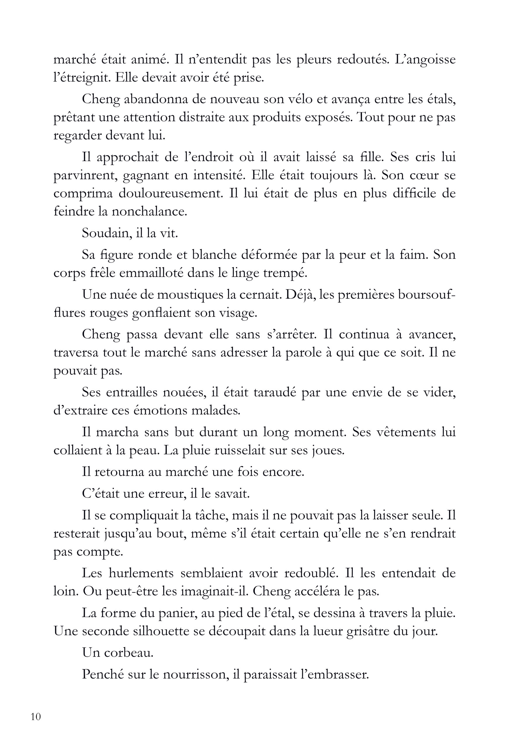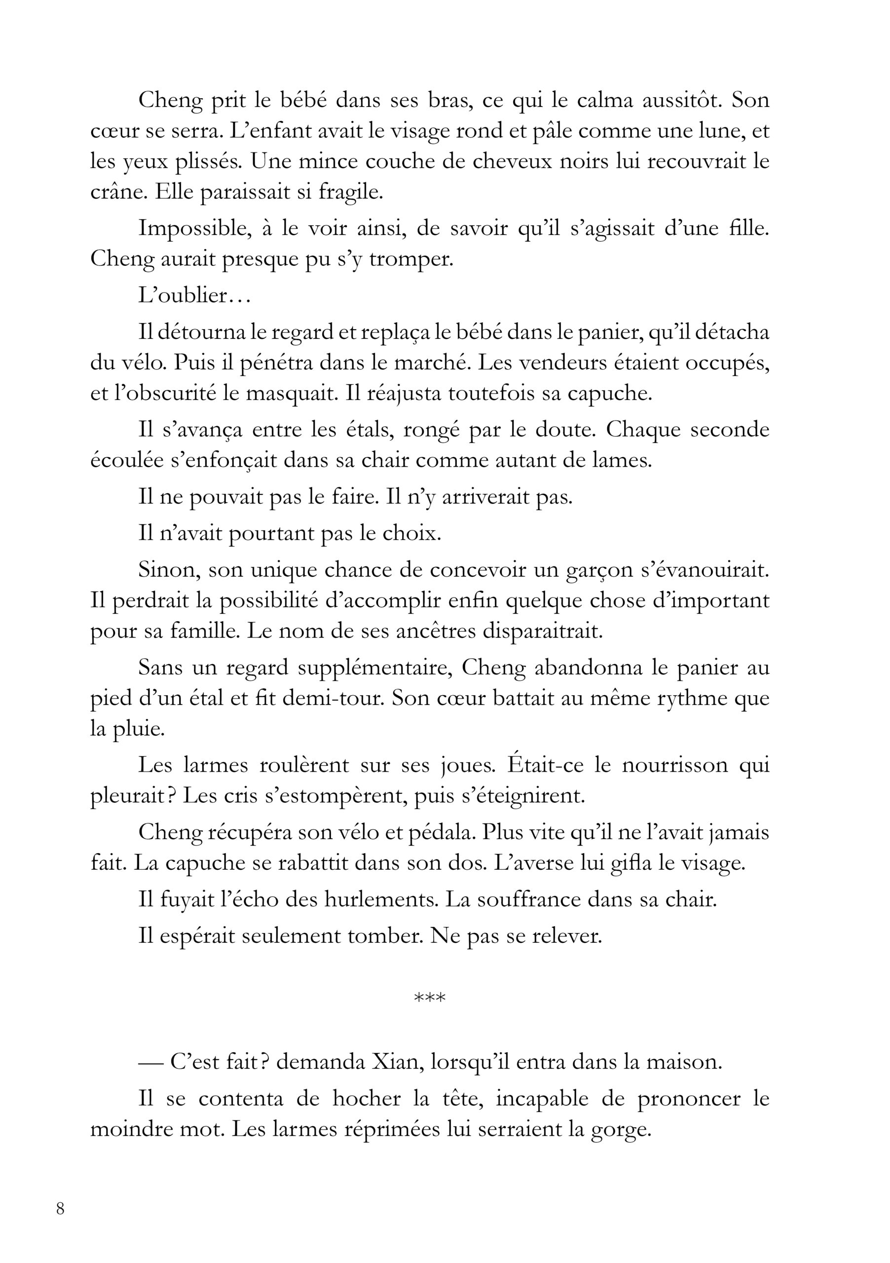 "J’ai trouvé ce roman très intéressant, notamment à cause des deux personnages principaux, Zhaodi et Cheng, tous deux victimes à leur manière d’un système patriarcal qui étouffe les personnalités qui ne rentrent pas dans le moule et qui ne font pas ce que l’on attend d’elles. On voit bien l’emprise psychologique que ces valeurs ont sur eux et comment elles les détruisent."
